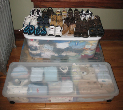 But I think what shocked us the most is the shoes. Seventeen pairs of shoes. Well, eighteen if you count the Uggs. That’s almost as much as his parents’ combined shoe collection. And the kid won’t be walking until when?